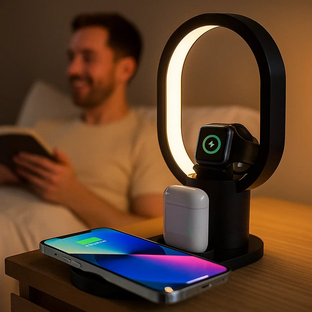 4 en 1: Carga simultáneamente tu celular, reloj inteligente, auriculares y disfruta de su lámpara de mesa.